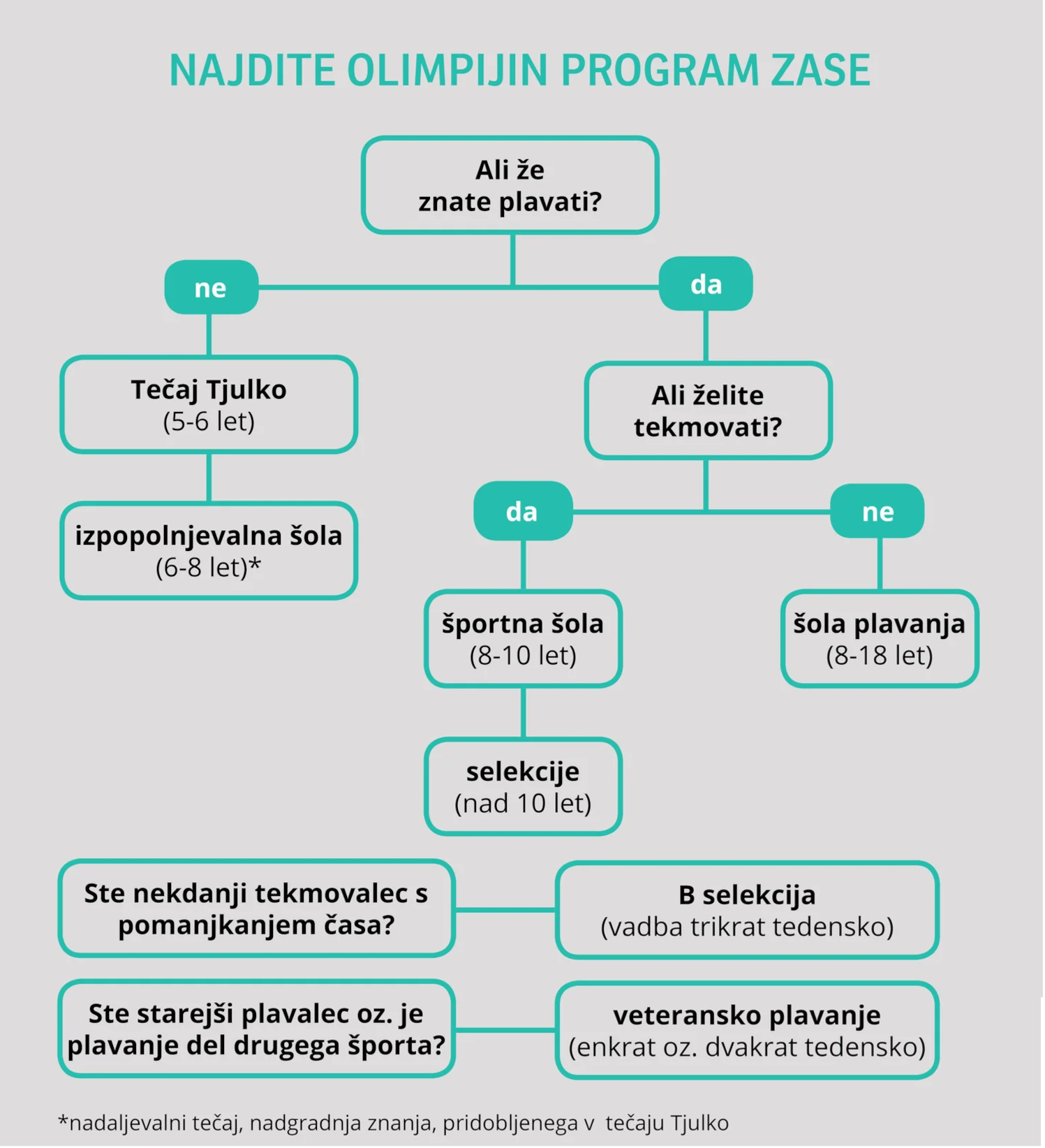 V Plavalnem klubu Olimpija verjamemo, da imamo prav za vsakega program, ki mu ustreza. Da vam olajšamo proces odločanja, smo za vas pripravili infografiko, pod to pa najdete podrobnejše opise programov in povezavo do prijave v program.